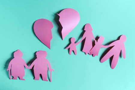 Bright red human figures of people, a large heart divided into two parts on a colored background. The concept of the crisis of family relations. Cardboard figures of adults and children close-up