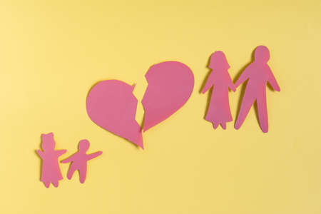 Colored cardboard figures of adults and children with a broken heart on a yellow background. The concept of complex relationships between adults and children