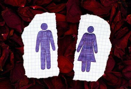 Two pieces of paper with hand drawn man and woman figures on dry petals of roses background. Doodle style.