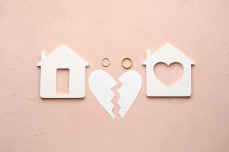 Figures of houses, broken paper heart and wedding rings on pink background. concept of divorce