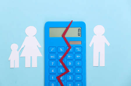 Broken family, divorce. Property division concept. Split paper family, calculator on blue background