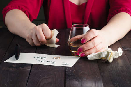 Word Divorce made of wooden block letters and devastated middle aged caucasian man in a black suit sitting at the table with the glass of whiskey, top view composition with dramatic lighting