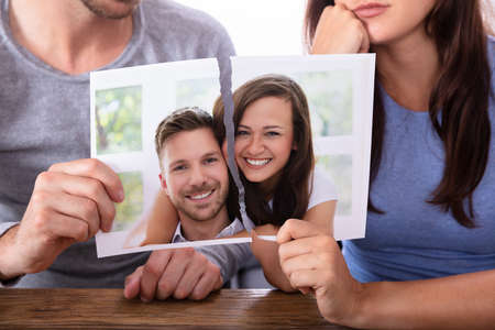Divorce. Angry Woman Ripping Wedding Photo With Ex-Husband After Breakup Indoor. Selective Focus
