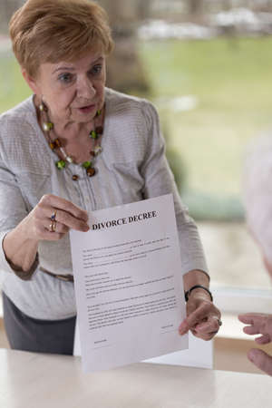 close-up shot of teared divorce decree and engagement rings on wooden table