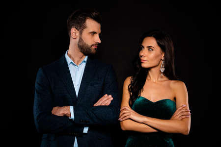 Close up side profile photo amazing pair she her chic he him his macho stand back to back arms crossed best partnership wear blue costume jacket green glossy velvet dress isolated black background