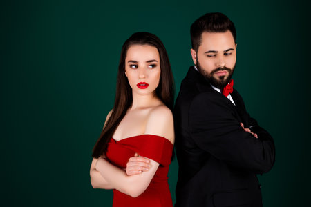 Photo of stunning young girl guy couple stand backs conflict angry wear trendy fancy classy outfit isolated on green color background