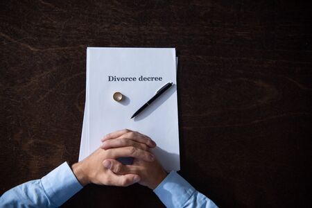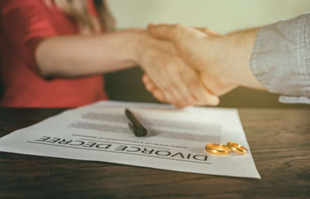 Hands of wife, husband signing decree of divorce, dissolution, canceling marriage, legal separation documents, filing divorce papers or premarital agreement prepared by lawyer. Wedding ring