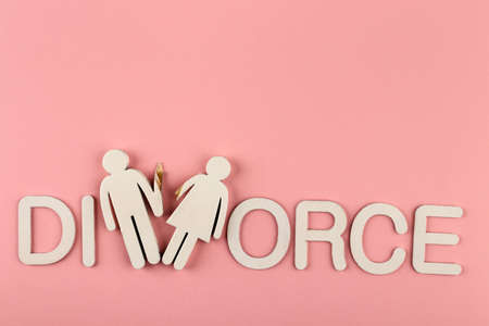 Broken family concept, divorce. Two wooden figurines and and letters on pink paper background.