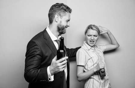 lets celebrate. woman show time on clock. wife wondering why husband reveler came home so late. family routine. problems in relationship. family psychology. unhappy life. man alcoholic drink wine
