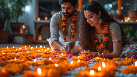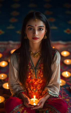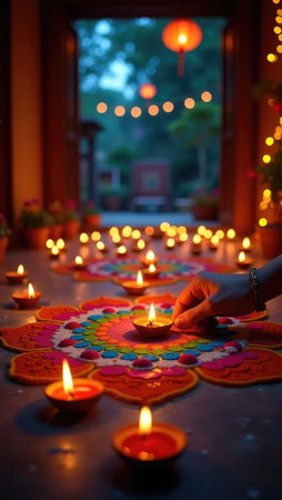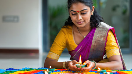 A young woman in a vibrant traditional outfit lights diyas during a festive celebration, surrounded by a colorful rangoli design, radiating warmth and joy.