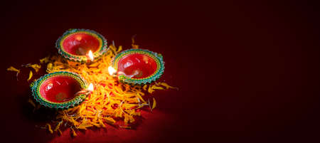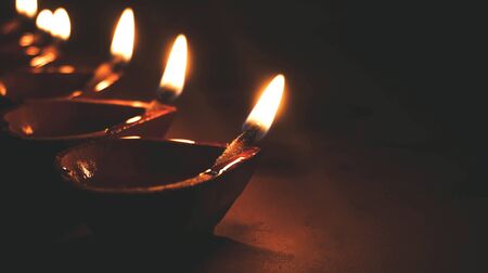 Happy Diwali - Clay Diya lamps lit during Dipavali, Hindu festival of lights celebration. Colorful traditional oil lamp diya on dark background. Copy space for text.