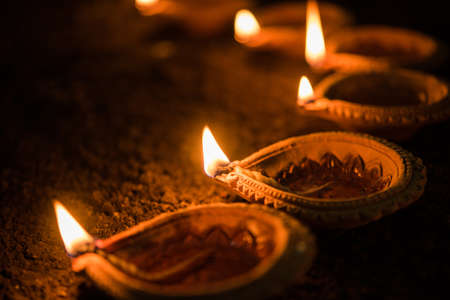 Happy Diwali - Clay Diya lamps lit during Dipavali, Hindu festival of lights celebration. Colorful traditional oil lamp diya