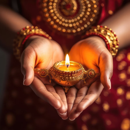 Diwali Festival of lights celebration. Diya lamp in woman hands, close up