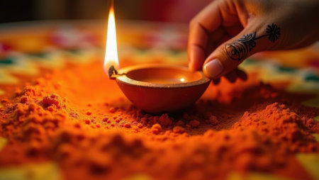 Dashahra, India. An extreme close-up revealing the beautiful texture of rangoli powder and a traditional oil lamp. A sensory detail shot that captures the essence of the festival.