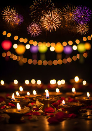Experience the magic of Diwali with bright lamps lighting up the night sky in a traditional celebration of love and light.