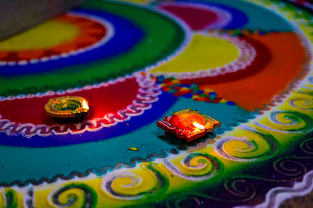 Beautiful decoration of Diwali or Deepavali oil lamps lit on colorful rangoli. Hindu festival of lights celebration.
