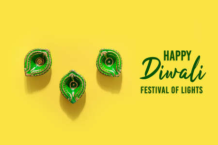 Happy Diwali - Clay Diya lamps lit during Diwali celebration. Greetings Card Design of Indian Hindu Light Festival called Diwali