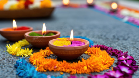 This vibrant image captures beautiful diyas and a colorful rangoli design created with fresh flowers during a festive celebration in India.