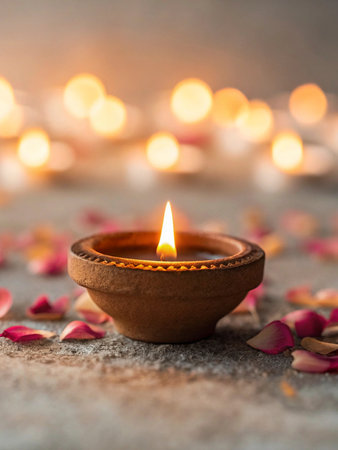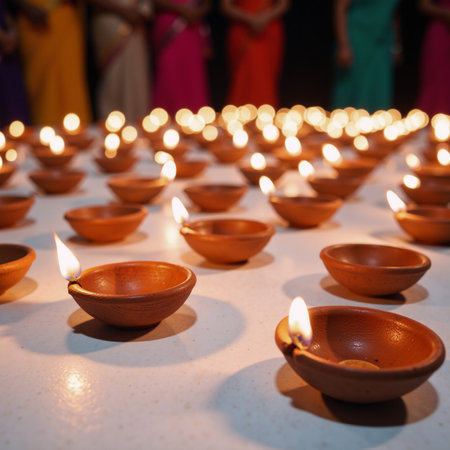 Beautifully glowing clay diyas illuminate a joyful Diwali celebration scene