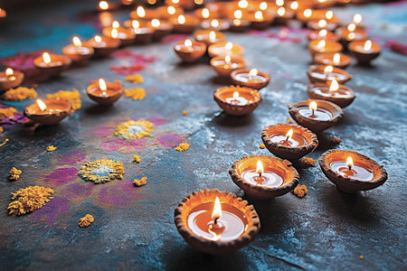 A serene display of glowing clay diyas with vibrant rangoli patterns creates a festive ambiance by Generative Ai.