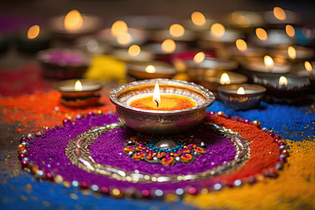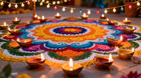 Mandala showing colorful diwali rangoli with numerous lit oil lamps on a dark floor keywords: diwali, rangoli, festival, india, celebration, tradition, culture, religion, hinduism, lamps, diyas, oil lamps, light, glowing, illuminated, colorful, intricate, pattern, design, floral, mandala, symmetrical, decorative, floor, dark, night, auspicious, spiritual, festive, vibrant, bright, warm, ambiance, tradition, cultural event, religious festival, decoration, ornamental, artistic, handicraft,...