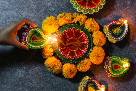Close up woman hand being lit clay light fire on Diya or oil lamp studio shot on black wooden background, Decoration of Hinduism rangoli, Happy celebration Deepavali or Diwali festival concept
