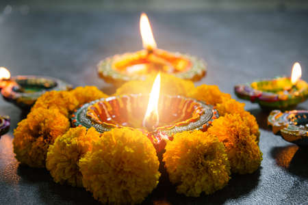 Happy Diwali - Clay Diya lamps lit during Dipavali, Hindu festival of lights celebration. Colorful traditional oil lamp diya and flowers on purple background