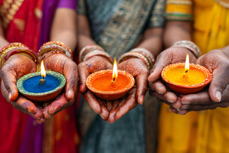Indian women holding colorful traditional oil lamps celebrating Diwali festival