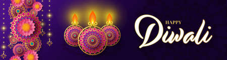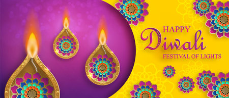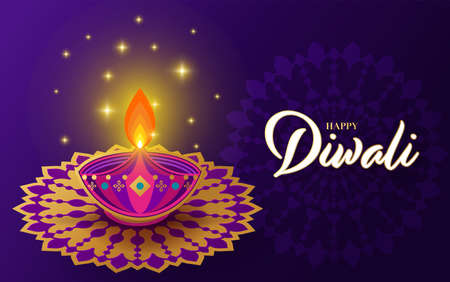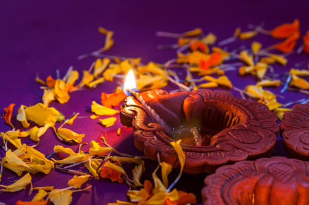 Happy Diwali - Clay Diya lamps lit during Dipavali, Hindu festival of lights celebration. Colorful traditional oil lamp diya on purple background