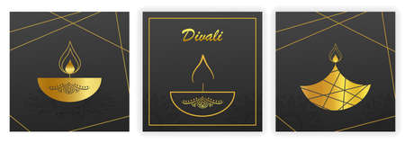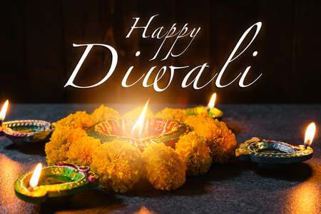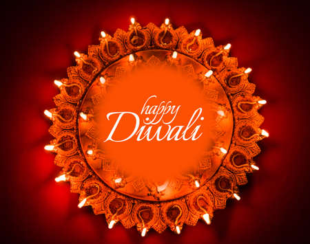 Happy Diwali - Clay Diya lamps lit during Diwali celebration. Greetings Card Design of Indian Hindu Light Festival called Diwali