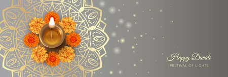 Happy Diwali. Diya oil lamp and flowers on red background. Traditional Hindu celebration. Religious holiday of light. Copy space, banner format.