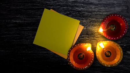 Diya oil lamps for the Diwali festival with empty note paper for copy space. Diwali Festival. The Hindu Festival of Lights celebration