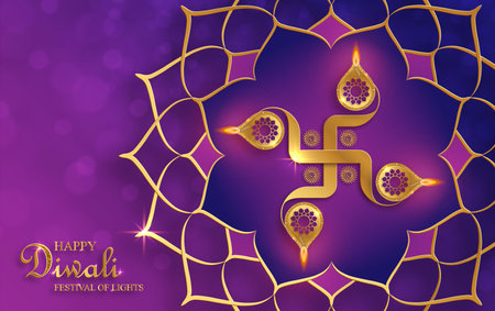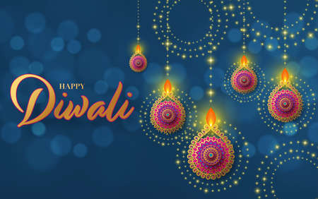 Vector greeting of Happy Diwali, Dipawali, Indian festival of lights, danglers, diya, oil lamp and lotus on beautiful pattern, holiday wishes poster.