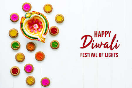 Happy Diwali - Clay Diya lamps lit during Dipavali, Hindu festival of lights celebration. Colorful traditional oil lamp diya on white wooden background