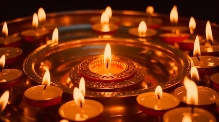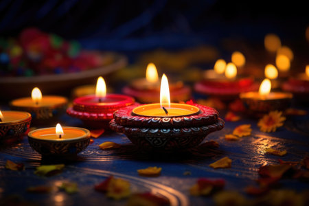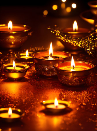 Lit candles casting warm light on a table, Glowing diyas spreading a warm and welcoming light