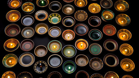 A collection of colorful diyas with flickering flames creates a warm and inviting atmosphere for festive celebrations, symbolizing light and joy.