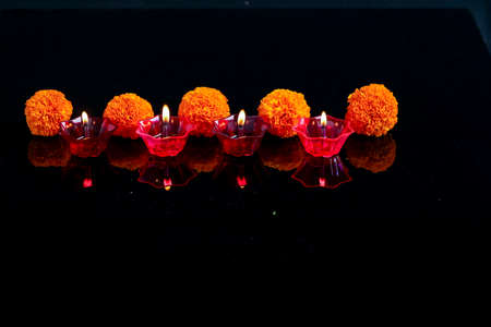 Indian festival diwali ,marigold flower and Colorful lamps of oil on black background