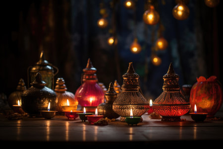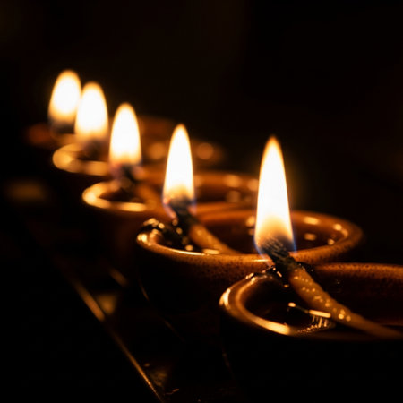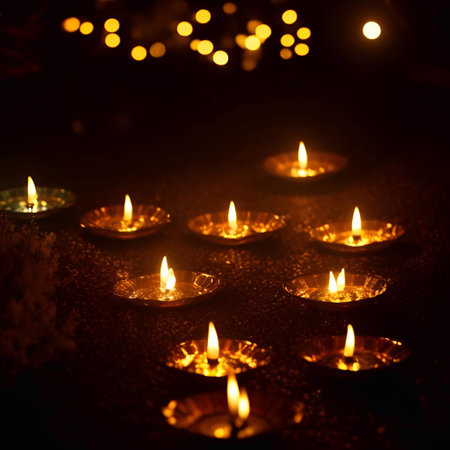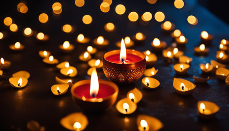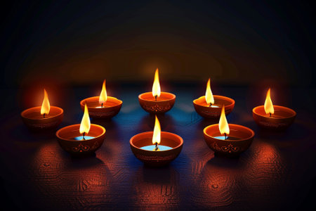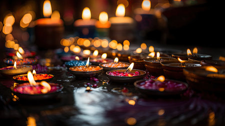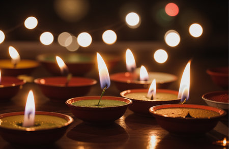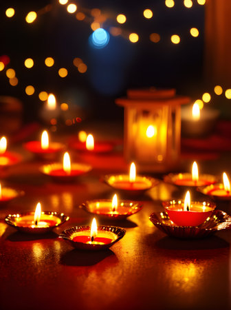 Lit candles casting warm light on a table, Glowing diyas spreading a warm and welcoming light