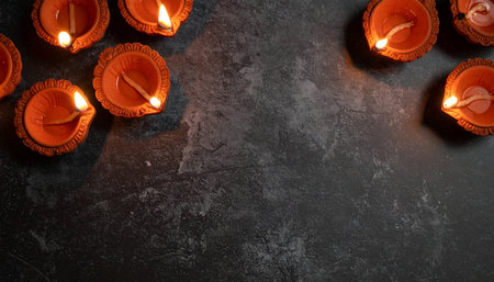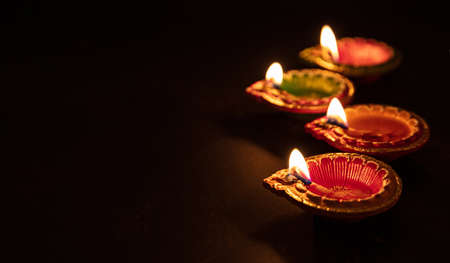 Happy Diwali - Clay Diya lamps lit during Dipavali, Hindu festival of lights celebration. Colorful traditional oil lamp diya on dark background. Copy space for text.