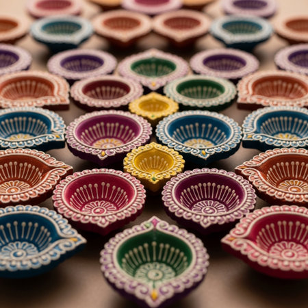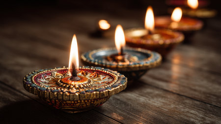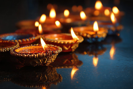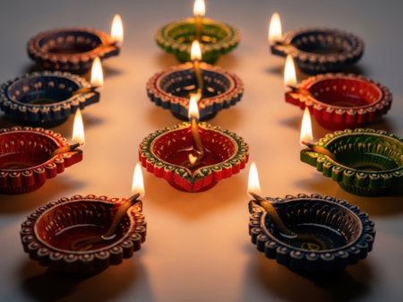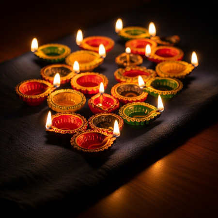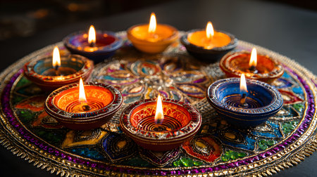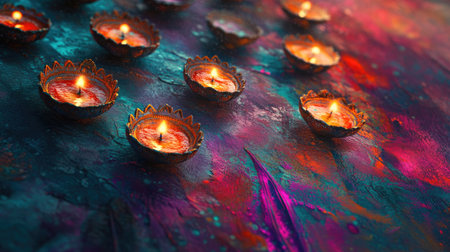 Hand-painted diyas with glowing flames, sitting gracefully on a colorful surface during an Indian festival