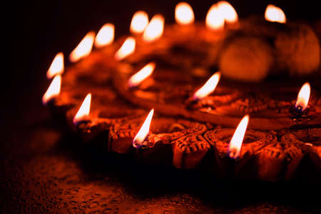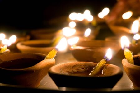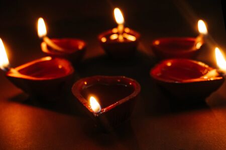 Close up of burning diya lamps in diwali celebration.