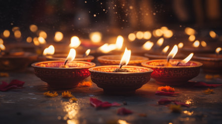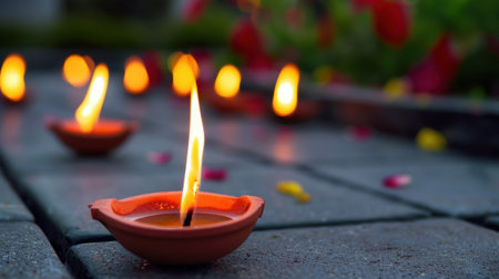 A serene outdoor scene featuring traditional clay diyas with glowing flames placed along a stone pathway, surrounded by colorful flower petals, evoking a sense of warmth and cultural celebration.