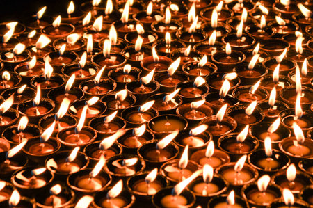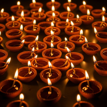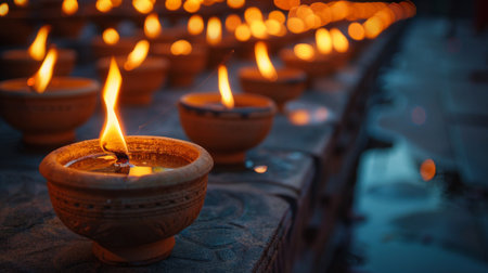 Cultural celebration with rows of small flames in earthenware lamps.