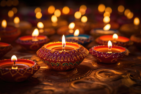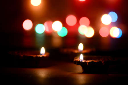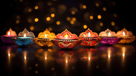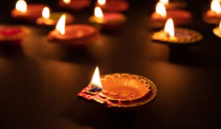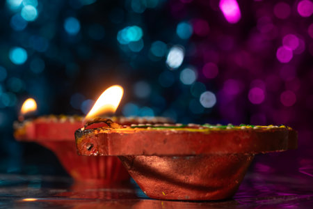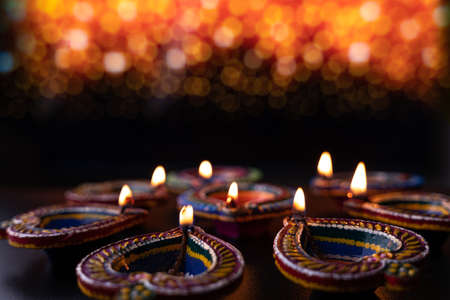 Traditional Diwali Diyas are illuminated with vibrant colors on the bokeh background during the festival of Diwali.