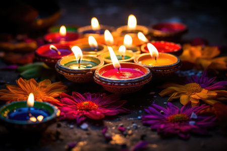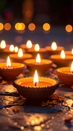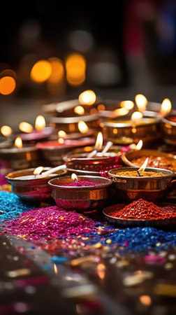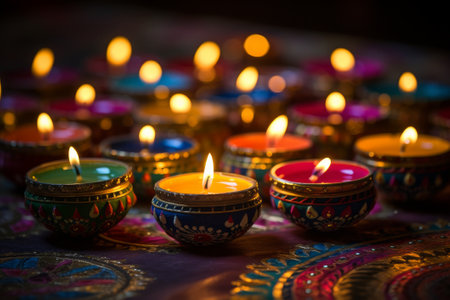 A collection of colorful diyas with flickering flames creates a warm and inviting atmosphere for festive celebrations, symbolizing light and joy.