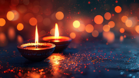 Two traditional Diwali diyas lit with colorful bokeh background. Celebration of Hindu Light Festival.