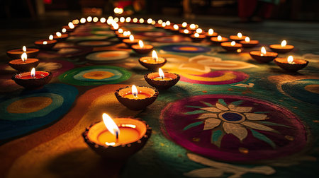 diwali diyas glowing in a beautiful pattern on the floor, created with generative ai