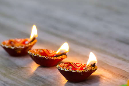 Happy Diwali. Clay Diya lamps during Diwali celebration, Hindu festival of lights celebration.