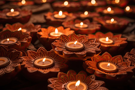 Diwali diya lamps lit during diwali celebration.