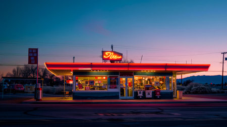 A roadside diner where travelers share stories over milkshakes and burgers, the neon sign flickering in the twilight.